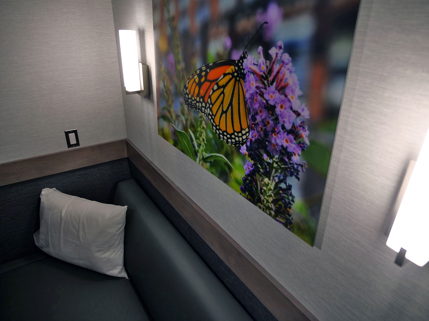 Minute Suites offers private rooms where airport passengers can relax, nap or work before a flight or during a layover. Each suite features a smart tv, a smart device, WiFi, workstation with chair and a daybed with pull-out trundle.